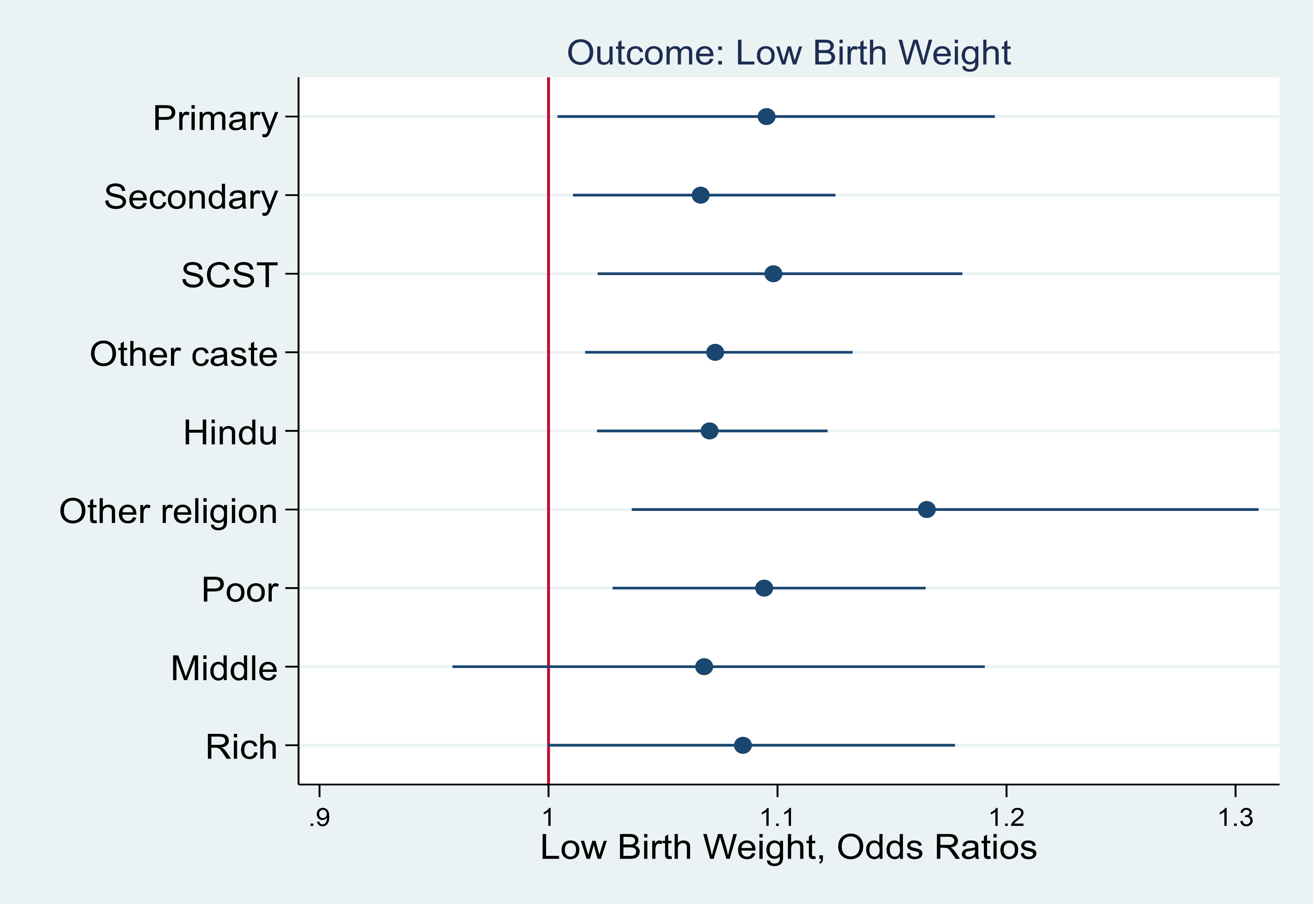 Further, we observe significant variability in the associations between LBW and household and maternal characteristics. Among the nine subsamples analysed, the association is statistically significant in eight, except for the middle wealth groups (Figure 1). Compared to the subsample with secondary maternal education (schooling of more than five years), pandemic cohorts born to mothers with primary or less than primary education (schooling of less than or equal to five years) have slightly higher odds of LBW. Specifically, in the less-than-primary-schooling sample, the adjusted odds ratio for LBW is higher (1.09 versus 1.06). The analysis by household caste shows that the effect of the Covid-19 pandemic on LBW probability is higher for children from scheduled caste/scheduled tribe (SC/ST) households, which are historically disadvantaged communities, than the children from other castes. The analysis by religion shows that the pandemic had adverse impacts on LBW for Hindu as well as non-Hindu households, but the effect size is smaller for Hindus as compared with non-Hindu groups. Moreover, the effects of the pandemic are significant only for the poor households and are statistically insignificant for the middle and rich wealth groups; however, the odds ratios are more than one for all three groups.