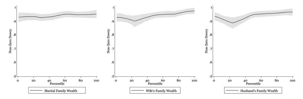 Contrary to what one might think, dowry payments in India are as prevalent in poor families as they are in rich families. Panel A of Figure 1 plots the share of marriages involving dowries by the marital family’s wealth rank. At each point of the wealth distribution, approximately 90% of marriages involve the payment of a dowry. Unsurprisingly, the dowry amount is higher for better-off families, with dowry payments in the top 10% of the wealth distribution being approximately six times the dowry payments in the bottom 10%. Analogous patterns emerge when plotting dowry prevalence against the wealth rank of the bride’s and the groom’s natal families, which we construct based on information about their land possessions and the fathers’ educational attainment (Panels B and C). Since dowries are widespread even among the economically worse-off families, it is critical to understand how marital transfers impact individual consumption and one’s likelihood to live in poverty.