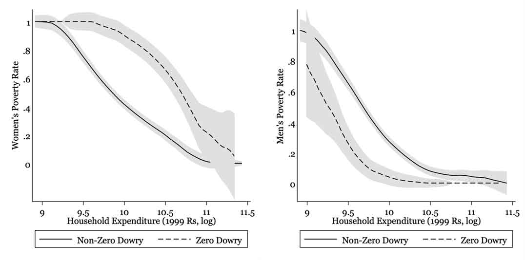 Figure 2. Individual-level poverty rates (for women and men), by household expenditure and dowry amount