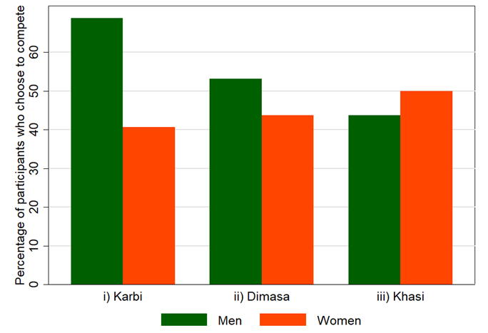 As depicted in Figure 2a, our experimental results support the hypothesis that gender-balanced norms remove gender gaps in competitiveness. While men compete almost twice as often as women among the patriarchal Karbi, this gender difference melts down to 18% among the Dimasa that have balanced gender norms, while women compete 13% more often than men among the matrilineal Khasi.