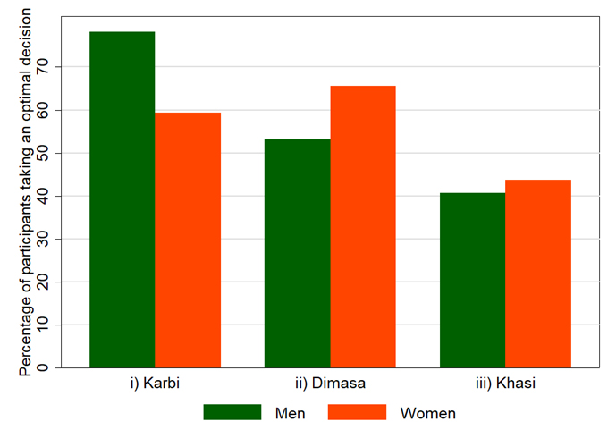 To assess whether patriarchy leads to worse economic outcomes for women through their choices and whether gender-balanced norms have the potential to remove this asymmetry, we also analyse the optimality of choices. According to Figure 2b, we find that women among the patriarchal Karbi compete too little, making choices that maximise their payoffs 33% less often than men. In contrast, among both Khasi and Dimasa, where more female competitiveness is observed, women’s choices are payoff-maximising more often than men’s.