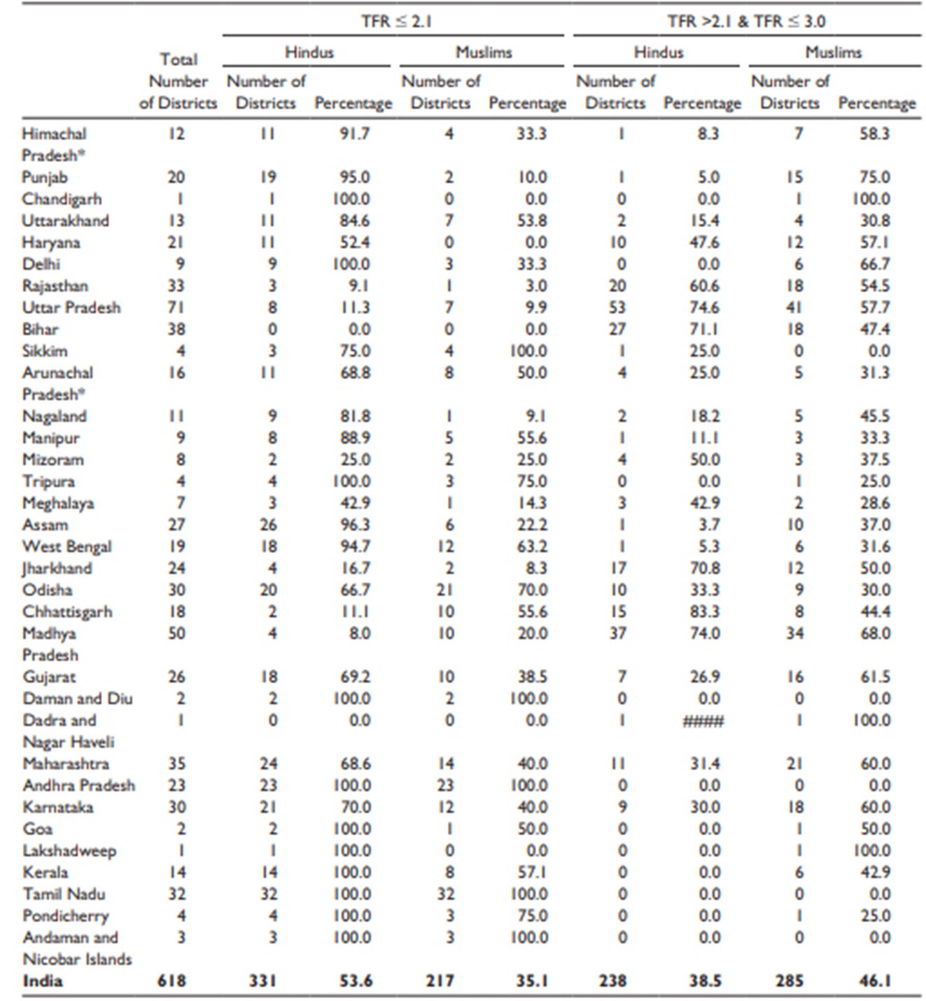 तालिका 2 जिला स्तर पर हिंदू-मुस्लिम प्रजनन में अंतर की एक विशद तस्वीर प्रदान करती है। 618 जिलों में से, लगभग 54% जिलों (331 जिलों) में हिंदुओं का टीएफआर प्रजनन के प्रतिस्थापन स्तर पर या उससे नीचे पहुंच गया है, जबकि मुस्लिमों के टीएफआर ने 35% जिलों (217 जिलों) में इस तरह के स्तर को प्राप्त किया है, जिसमें राजन (2005) द्वारा 2001 की जनगणना से प्राप्त अनुमानों से काफी वृद्धि हुई है।