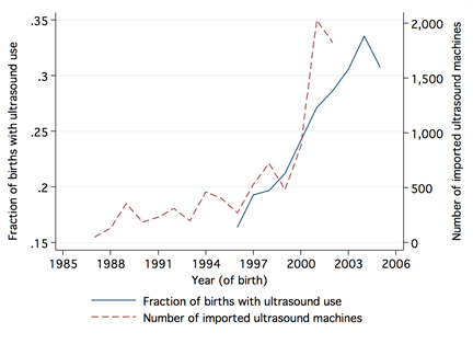 Prenatal sex detection technology (henceforth, ultrasound) has altered the demographic landscape in India and other countries where sons are valued more than daughters. An ultrasound scan can reveal foetal sex quite reliably at as early as 12 weeks of gestation, enabling selective abortion of unwanted girls without, in principle, risking the mother's health. In India, ultrasound was introduced in the mid-1980s, by when abortion had already been legalised. The low-cost and the non-invasive nature of ultrasound scans has led to their widespread use for foetal sex determination despite counteracting laws, resulting in a staggering rise in sex-selective abortion, equivalent to 6% of potential female births during 1995-2005 (Bhalotra and Cochrane 2010).
