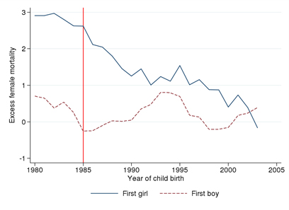 Figure 3. Excess female under-five mortality by firstborn sex, before and after ultrasound access