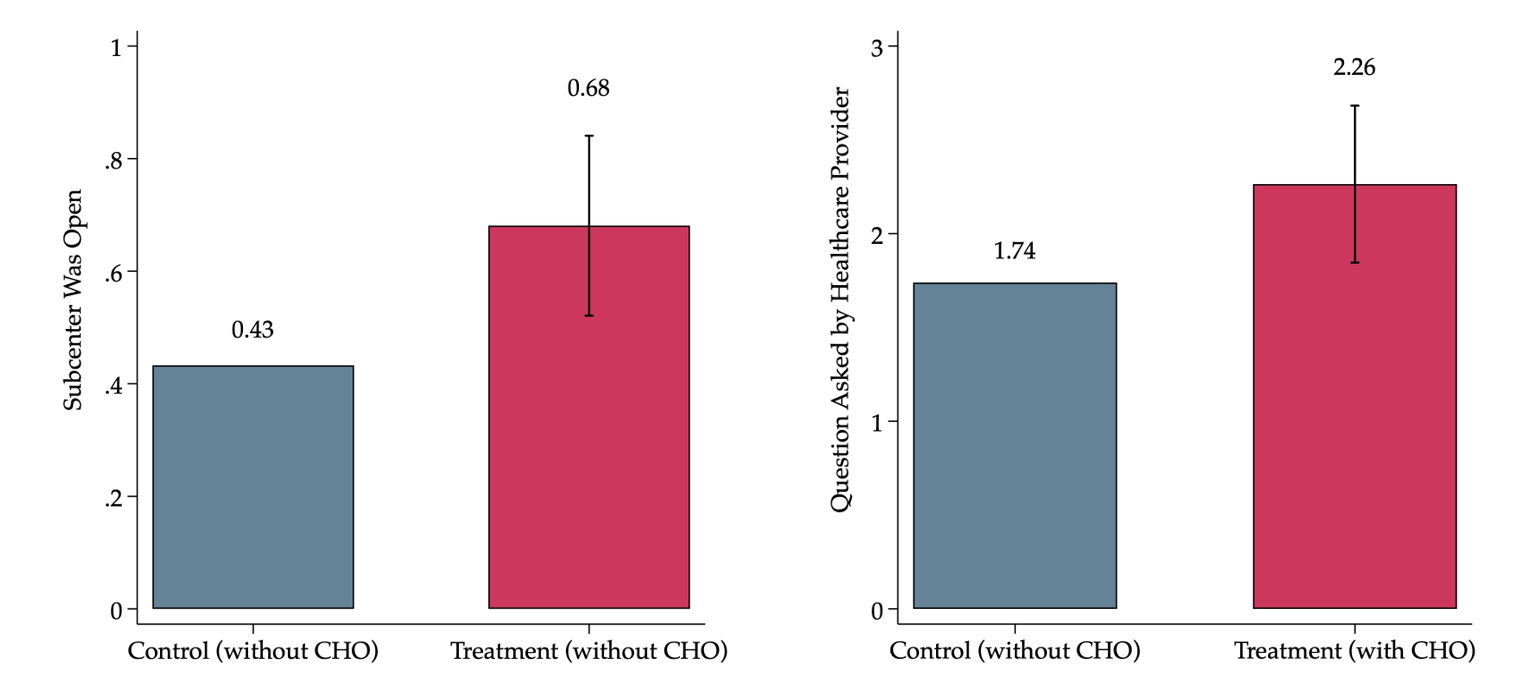 Notes: (i) The figure presents the results from unannounced audit visits and patient exit surveys. (ii) The left panel shows the share of sub-centres that were open at least at some point during the day of the unannounced visit. (iii) The right panel shows the number of questions that a healthcare provider at the sub-centre asked the patient according to patient exit surveys. (iv) The whiskers correspond to 95% confidence intervals (indicating that if we repeated the study many times, the true effect would fall within this range in 95 out of 100 cases) based on ‘standard errors’ clustered at the sub-centre. (v) Sub-centre-level weights for the control group are constructed by inverse probability weighting, which gives more weight to those sub-centres that were more likely to receive a CHO.