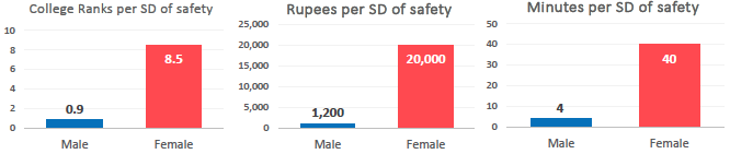 - College quality: I find that women are willing to choose a college that is in the bottom half of the quality distribution over a college in the top 20% for a route that is perceived to be safer, by one standard deviation3 (SD). Men on the other hand are only willing to go from a top 20% college to a top 25% college for the same increase in (one SD) perceived travel safety. To help put this into perspective, I use district-level data on rape from the Indian National Crime Records Bureau. A SD of perceived safety while walking is equivalent to a 3.1% decrease in the rapes reported annually.