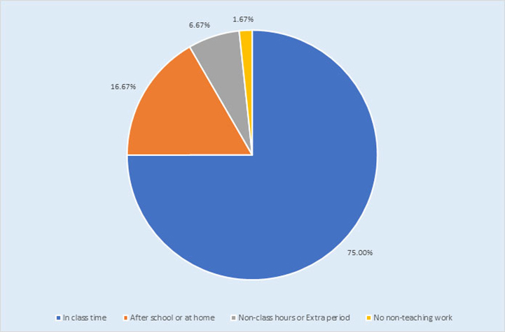 कक्षा में शिक्षण कार्य प्रतिदिन लगभग 2.5-3 घंटे तक होता है, अर्थात निर्धारित समय का लगभग 50-60%। इस प्रकार पढ़ाई संबंधी कुल कार्य का समय आरटीई द्वारा अनिवार्य किए गए समय से काफी कम है। जैसा कि देखा गया है - पढ़ाई संबंधी कार्यों का समय कम होने के मुख्य कारणों में से एक कारण गैर-शैक्षणिक कार्य का बोझ है। यह संभव है कि शिक्षक पढ़ाई के लिए निर्धारित घंटों के दौरान कक्षा में छात्रों के साथ समय न बिताने का एक बहाना यह दे सकते हैं कि उनके ऊपर गैर-शैक्षणिक कार्य का बोझ है। हालाँकि, गैर-शैक्षणिक कार्य के बोझ को अनदेखा नहीं किया जा सकता है।