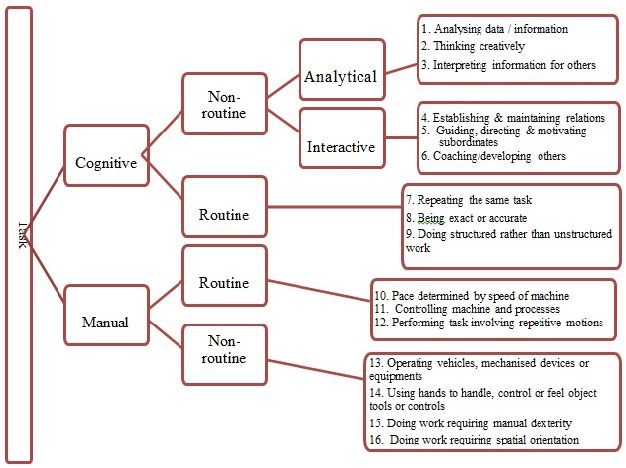 The Indian economy is not isolated from the ongoing wave of the technological revolution as the use of digital technology has become quite visible in many sectors. However, little is known about its impact on jobs. We examined this issue in a task-based framework. Data needed for the estimation of task content of jobs has been drawn from two different sources. Following the standard literature, we have used the Occupational Information Network (O-Net1) database as a source of information on task intensities of different occupations. Detailed information on employment in the Indian economy has been taken from several rounds of the Employment and Unemployment Survey (EUS2). Combining the O-Net and Employment Unemployment Surveys data, we calculated the five main task content measures – non-routine cognitive analytical (NRCA), non-routine cognitive interactive (NCRI), routine cognitive (RC), routine manual (RM), and non-routine manual (NRM) – by adding up the appropriate task items, as depicted in Figure 1 (Vashisht and Dubey 2018).