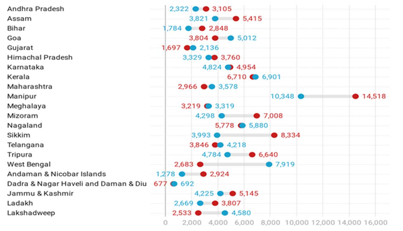 नोट: (i) नीले और लाल गोले क्रमशः 2015-16 और 2019-20 में ओओपी खर्च को दर्शाते हैं। (ii) चार्ट में एनएफएचएस-5 के पहले चरण में सर्वेक्षण किए गए राज्यों और संघ राज्‍य क्षेत्रों को शामिल किया गया है।