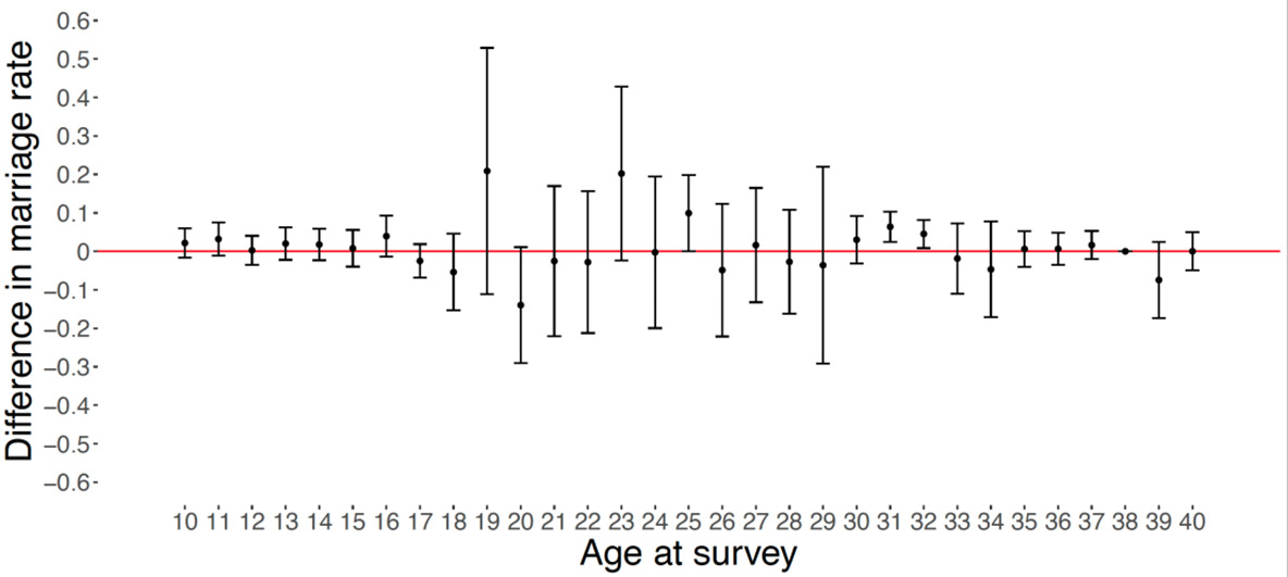 Though we are unable to provide direct evidence on any mechanism, consideration of these mechanisms is important as they might imply different welfare consequences for women. Current literature suggests early marriage has detrimental consequences for women through lower human capital investments and higher fertility (which our results are consistent with), but the question of what early marriage during a time of displacement means for women’s welfare is a crucial one which we are unable to answer fully – making this is an important question for future research in this area.
