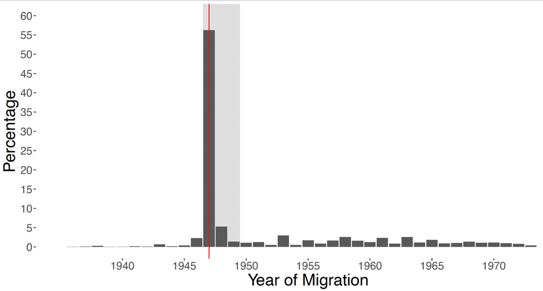 The end of British rule in India in August 1947 resulted in the partition of India into two countries – the Hindu-majority State of India and the Muslim-majority State of Pakistan. The partition led to one of the largest and most rapid migrations in human history. By 1951, an estimated 14.5 million people were displaced along religious lines, with 6.5 million displaced into Pakistan (Bharadwaj et al. 2008). We focus on Muslim women who were displaced into the Punjab province of Pakistan in the period right after partition. Figure 2 reports the migration timing of Indian-born women into Pakistani Punjab. A vast majority of displacement induced by partition occurred from 1947-1949. After partition, the sudden inflow of non-selected migrants who were culturally, ethnically, and linguistically similar to people from Indian Punjab means that Pakistani Punjab provides a unique opportunity to strengthen the evidence on the impact of displacement on marriage outcomes found in the cross-country analysis.