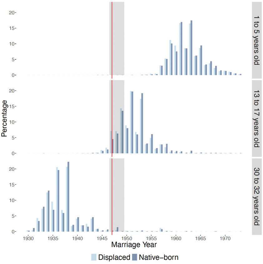 Figure 3 plots the empirical densities of the year of first marriage for native-born and displaced women by age group. Adolescent displaced women were 5.3 percentage points more likely to get married at the time of partition between 1947 and 1949. Consequently, the child marriage rate for adolescent displaced women increased by 3.4 percentage points (relative to a rate of 11.4% for native-born young women). In addition, adolescent displaced women experienced higher fertility both in terms of births and surviving children6.