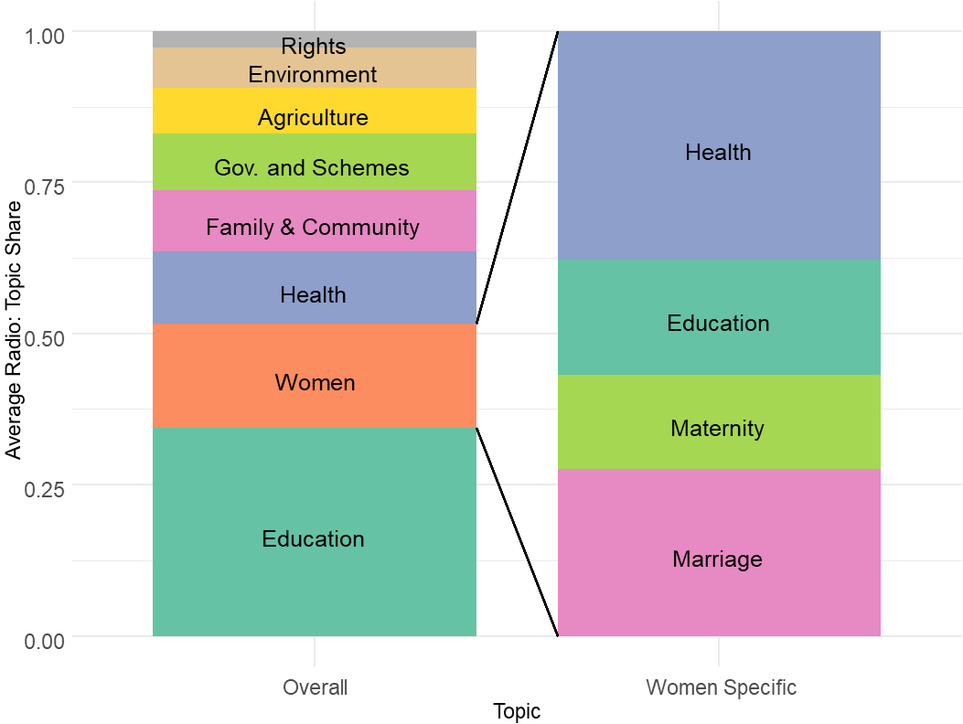 टिप्पणी : यह आँकड़ा औसत रेडियो स्टेशन के विषयों के वितरण को दर्शाता है। इसके लिए, रेडियो शो के अनुवादित ट्रांसक्रिप्ट को एलडीए मॉडल का उपयोग करके विषय साझाकरण प्रदान किया जाता है। एलडीए विशेष रूप से एक ऐसा मॉडल है जिसमें ट्रांसक्रिप्ट को कई विषयों का संयोजन का मिश्रित रूप माना जाता है। विषय विषय से जुड़े शब्दों और वाक्यांशों, मान्यताओं आदि के आधार पर, एलडीए फिर विषयों को परिभाषित करता है और दिखाता है कि प्रत्येक ट्रांसक्रिप्ट का कितना हिस्सा किस विषय से लिया गया है (अधिक विवरण के लिए हैनसेन एवं अन्य, 2018 को देखें)। सबसे अधिक पूर्वानुमानित पदों के आधार पर विषयों को नाम देने के बाद, मैं सबसे पहले प्रत्येक रेडियो स्टेशन के औसत विषय हिस्से की गणना करता हूँ और इसके आधार पर, औसत रेडियो स्टेशन की सामग्री की गणना करता हूँ। मैं ऐसा करने से पहले, विकास-संबंधी संदेशों का अंदाज़ा देने के लिए मनोरंजन (औसत रेडियो स्टेशन की अपलोड की गई सामग्री का 24%) और अन्य अपरिभाषित विषयों (17%) को विज़ुअलाइज़ेशन से बाहर रखता हूँ।