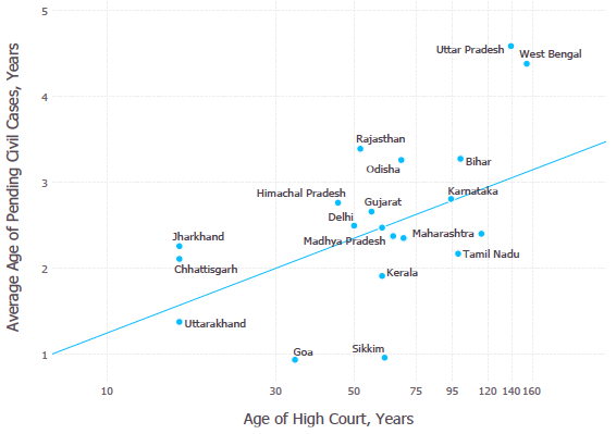 (i) Backlogs accumulate over time, hence the oldest high courts are the most congested ones (see Figure 2); and