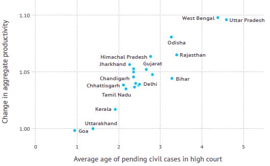 The strength of contract enforcement determines how firms source inputs and organise production, and hence influences productivity. Using microdata on Indian manufacturing, this article quantifies the impact of congestion and delays in Indian courts of justice on aggregate productivity. It finds on average across states, if court congestion were reduced to be in line with the least congested state, industrial productivity will increase by roughly 5%.
