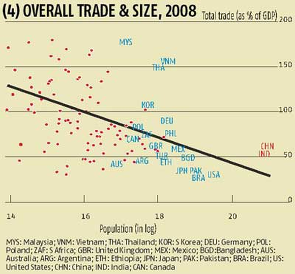 Figure 4 plots, for a number of countries, their overall trade-to-GDP ratio (on the vertical axis) against their size (measured in terms of land or area on the horizontal axis). The line shows the average relationship between trade outcomes and country size. That line is downward-sloping, confirming the geography-based intuition that large countries trade less. For example, the large countries such as China, India, Brazil, the United States and Japan are all in the lower right-hand corner with low trade (below 50-55%) ratios.