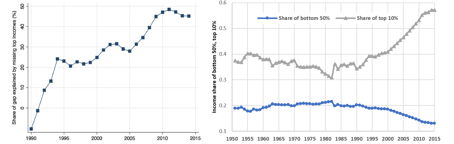 Figure 2. Missing top incomes as a proportion of the NA-survey income gap (left panel), and rising income inequality (right panel)