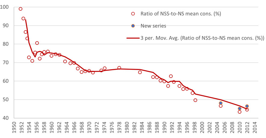 Notes: i) The graph shows the ratio of nominal values of per capita consumption from NSS surveys to that from the National Accounts (NA). ii) To mesh the survey and NA data, the latter (available on annual basis) are linearly interpolated to the mid-point of the survey period for each NSS round. iii) Survey estimates of per capita consumption relate to those based on the Uniform Recall Period. iv) The New Series (NS) refers to revised back series of NA after the base was shifted to 2011-12.