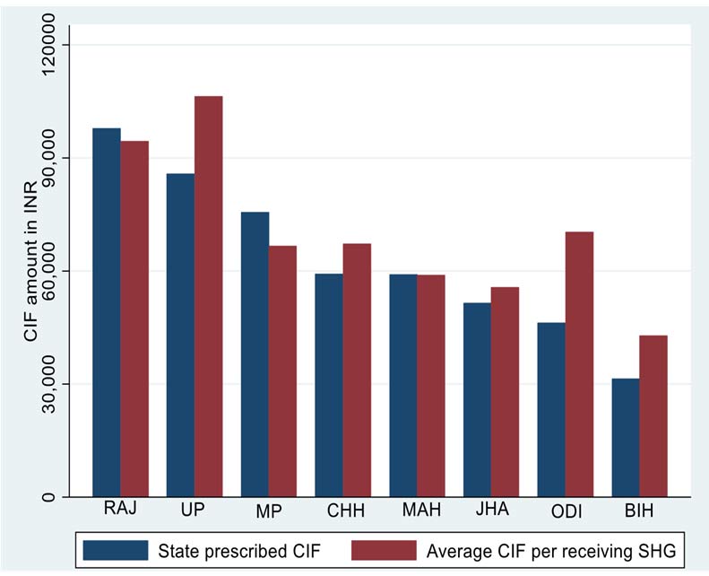 चित्र 1. राज्यों द्वारा निर्धारित सीआईएफ की औसत राशि, और एसएचजी द्वारा प्राप्त और रिपोर्ट की गई औसत राशि
