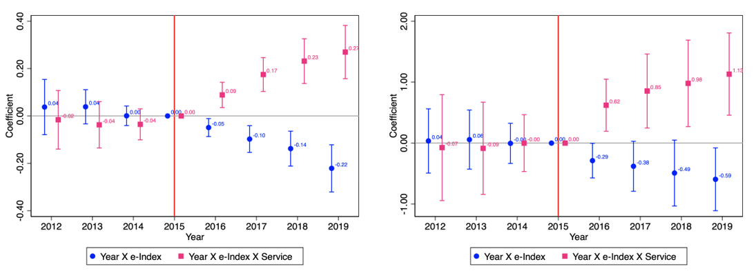 In other words, the same digital push produced winners and losers: services adapted and expanded, while manufacturing contracted. Figure 2 clearly shows the divergent trends, with manufacturing trending downward after 2016 and services, relative to manufacturing, trending upward in more e-Ready districts.
